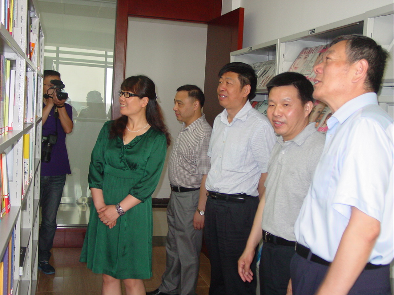 右圖為楊紀朝副會長(右一)一行在市委、市經(jīng)信委和公司領導的陪同下在公司圖書室參觀的場景。