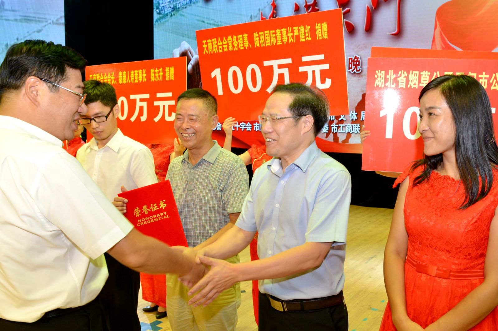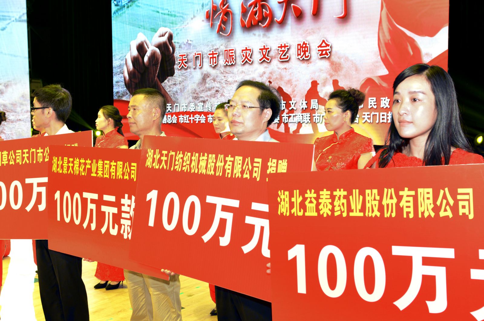 2016年9月2日晚,涼風(fēng)習(xí)習(xí),星光燦爛。由天門市委市政府主辦的主題為"風(fēng)雨共舟,情滿天門"的賑災(zāi)義演晚會(huì)拉開序幕。湖北天門紡織機(jī)械股份有限公司心系今夏受百年洪澇災(zāi)害的天門袍澤,慷慨伸出援助之手,繼前三次捐款捐物后,在義演會(huì)上再次捐贈(zèng)100萬元人民幣。