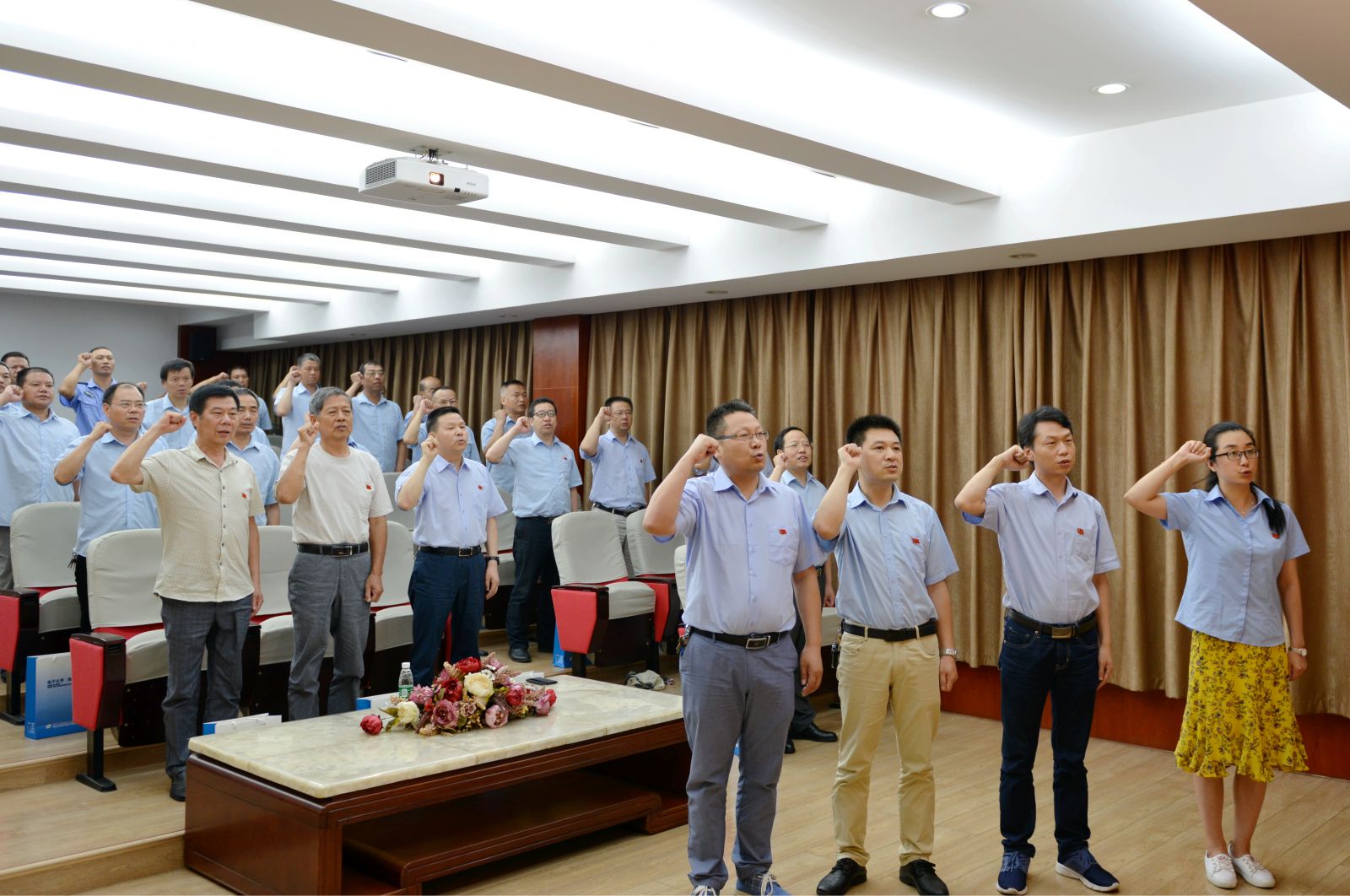 2018年6月30日上午,天門紡機黨委辦公室負責人參加了天門高新園組織召開的主題黨日暨半年工作總結大會,并在會上領取了高新園黨委授予的"先進基層黨組織"牌匾。下午,天門紡機組織全體黨員舉行"七一"慶?;顒樱军h委副書記、總經理焦倫進主持活動議程,黨委書記魯德文首先作工作報告,回顧了黨的光輝歷程,總結了公司近幾年黨建工作所取得的成績。隨后舉行新黨員宣誓儀式,全體黨員一道重溫了入黨誓詞。接著全國人大代表、公司董事長沈方勇作了熱情洋溢的演講,結合國際、國內形勢,分析了行業(yè)及公司面臨的嚴峻挑戰(zhàn),鼓勵全體黨員樹立信心、勇于擔當、克難奮進,為公司實現打造行業(yè)第一品牌的奮斗目標作出應有的貢獻。最后,全體黨員觀看了大型紀錄片《厲害了,我的國》。