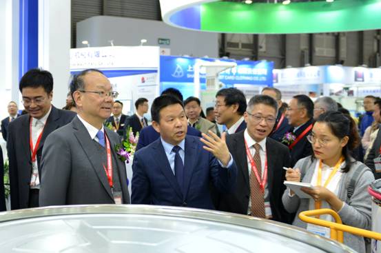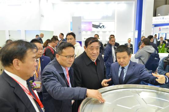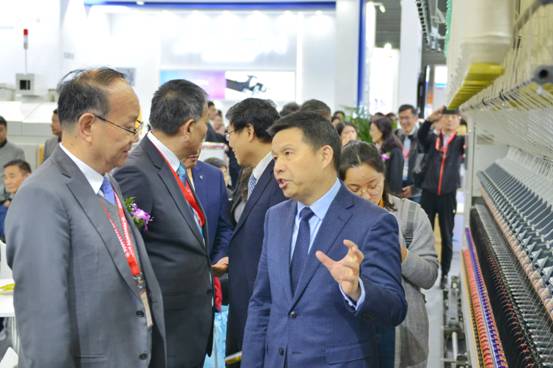 中國紡織工業(yè)聯(lián)合會黨委書記、秘書長高勇(左1)聽取董事長沈方勇介紹參展情況