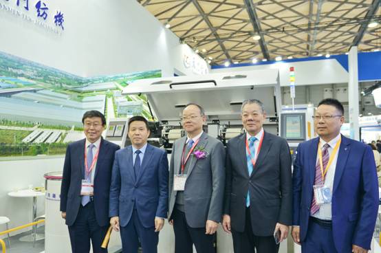 中國紡織機械協(xié)會會長顧平(右2)、福建新華源董事長陳宗立(左2)在天門紡機展位前合影