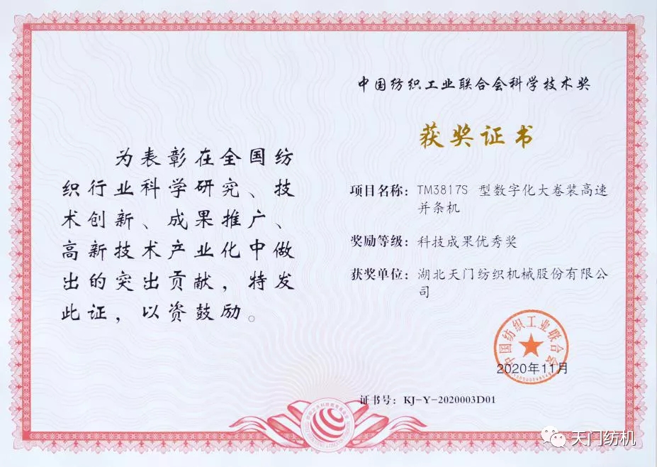 近日,中國紡織工業(yè)聯(lián)合會發(fā)布2020年度科技成果優(yōu)秀獎(jiǎng)獲獎(jiǎng)通知,并頒發(fā)證書,天門紡機(jī)TM3817S型并條機(jī)獲評“紡織之光”2020年度中國紡織工業(yè)聯(lián)合會“科技成果優(yōu)秀獎(jiǎng)”。鄭強(qiáng)、楊家軒、黃必廣、郭升旗、徐紅、譚鵬飛、沈忱等7名研發(fā)人員獲得個(gè)人“科技成果優(yōu)秀獎(jiǎng)”