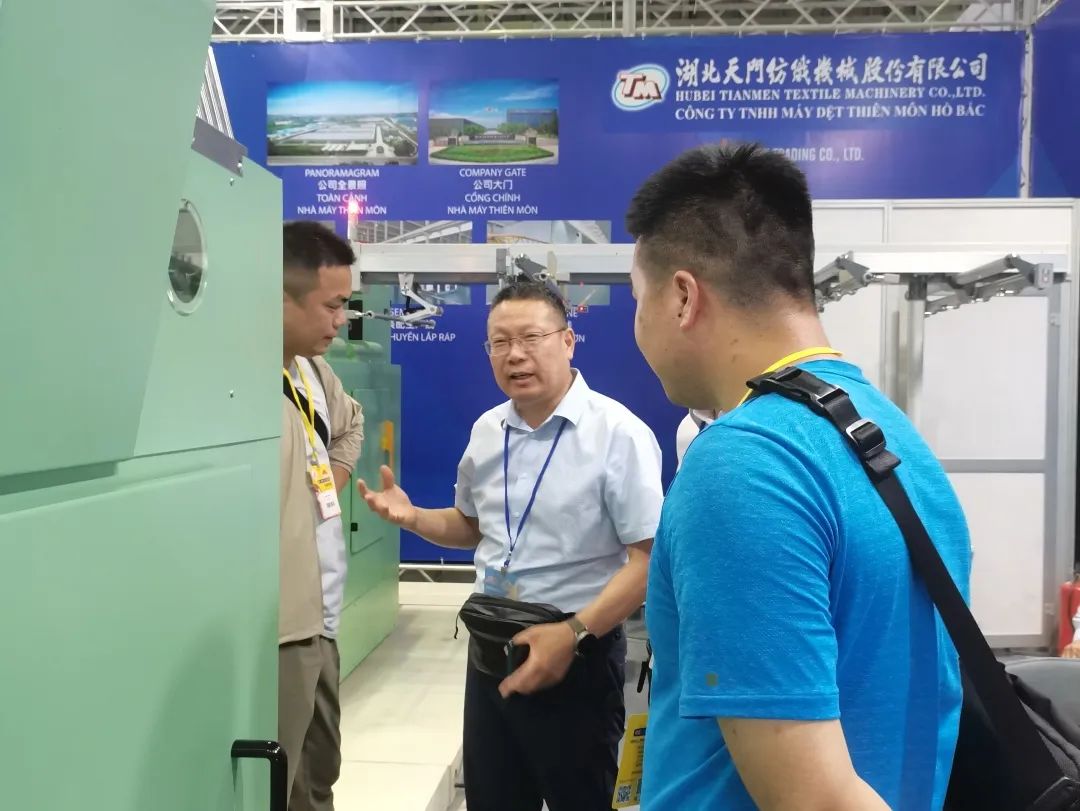 4月7日是展會的第三天,我司展位依然人流如織、門庭若市。越南Phung Hung紡織、Phu Bai國家紡織集團(tuán)、Hoa Tho紡織、太子龍紡織、天虹紡織等企業(yè)人士和專家觀摩了我司并條機(jī)。