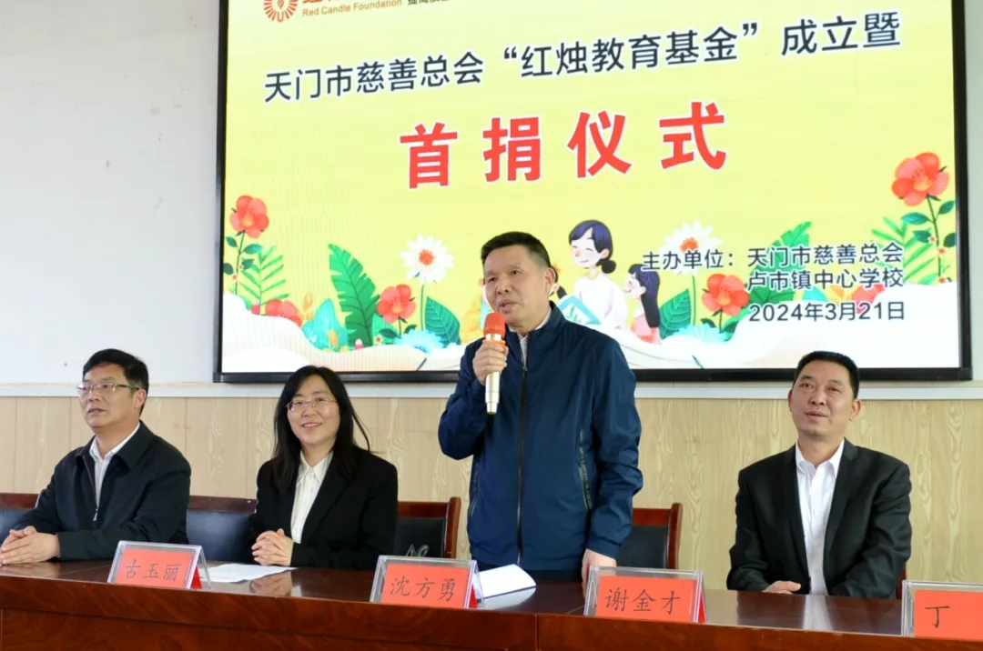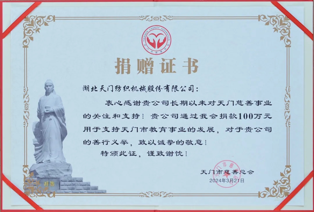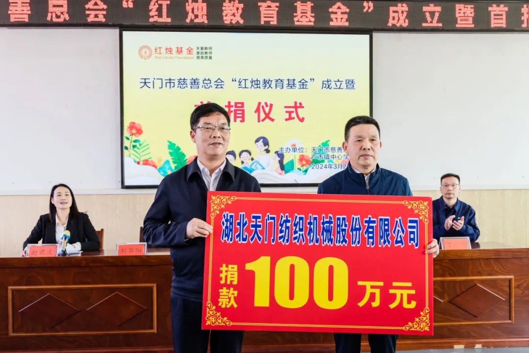 2024年3月21日,天門紡機(jī)董事長沈方勇出席在天門市盧市鎮(zhèn)盧家口中學(xué)舉行的天門慈善總會(huì)“紅燭教育基金”成立暨首捐儀式,同天門市慈善總會(huì)、教育局三方簽訂了《天門市慈善總會(huì)“紅燭教育基金”協(xié)議書》,并現(xiàn)場捐贈(zèng)100萬元,用于獎(jiǎng)勵(lì)盧市鎮(zhèn)優(yōu)秀教師和幫扶困難教師等公益活動(dòng),助力盧市鎮(zhèn)教育高質(zhì)量發(fā)展。天門市人民政府副市長古玉麗,天門市民政局局長、市慈善總會(huì)會(huì)長謝金才,天門市教育局局長劉華陽,天門市慈善總會(huì)秘書長李貴清,盧市鎮(zhèn)宣傳統(tǒng)戰(zhàn)委員劉恒超以及盧市鎮(zhèn)部分教師代表等參加首捐儀式。盧市鎮(zhèn)黨委書記趙君波主持儀式。